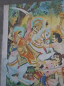 Rarely, Banai also appears in Khandoba's chief legend where he slays the demons Mani and Malla. Mhalsa and Banai (or Ganga) futilely help Khandoba in the battle to collect the blood of Mani, every drop of which was creating a new demon. Finally, the dog of Khandoba swallows all the blood. Rarely, Banai is described as seated behind Khandoba on the horse and fighting with a sword or spear, a role generally assigned to Mhalsa.[17]