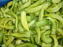 The banana pepper (also known as the yellow wax pepper or banana chili) is a medium-sized member of the chili pepper family that has a mild, tangy taste. While typically bright yellow, it is possible for them to change to green, red, or orange as they ripen.[1] It is often pickled, stuffed or used as a raw ingredient in foods. It is a cultivar of the species Capsicum annuum. Its flavor is not very hot (0–500 Scoville units) and, as is the case with most peppers, its heat depends on the maturity of the pepper, with the ripest being sweeter than younger ones.