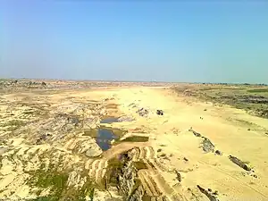 The Banas drains a basin of 45,833 km2, and lies entirely within Rajasthan. It drains the east slope of the central portion of the Aravalli Range, and the basin includes all or part of Ajmer, Bhilwara, Bundi, Chittorgarh, Dausa, Jaipur, Pali, Rajsamand, Sawai Madhopur, Sirohi, Tonk, and Udaipur districts.[1] The cities of Nathdwara, Jahazpur, and Tonk lie on the river. Major tributaries include the right bank tributaries of Berach and Menali and the left bank tributaries of Kothari, Khari, Dai, Dheel River, Sohadara River, Morel and Kalisil. This river is known as the Virgin River because it merges into the desert instead of the sea.[2]