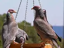 Its closest living relatives are the Chilean pigeon and the ring-tailed pigeon, which form a clade of Patagioenas with a terminal tail band and iridescent plumage on their necks.[4] There are at least 8 sub-species, and some authorities split this species into the northern band-tailed pigeon (Patagioenas fasciata)[5] and the southern band-tailed pigeon (Patagioenas albilinea).[6][7]