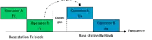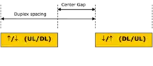 Centre gap is a key characteristic of FDD-based frequency arrangement represented by the gap between frequency blocks assigned for downlink and uplink respectively in the FDD-based arrangement as illustrated in Figure 5. It is common understanding that the duplex spacing and centre gap influence the duplexer performance so that larger separation brings the better isolation performance between downlink and uplink. Technically, this size of spacing affects the duplexer performance in the following two technical aspects: