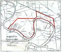 After the Siamese revolution in 1932, instead of transferring cargo from ship to ship moored in the harbour bays of Ko Sichang and Bangkok, the government wanted to build a port. In 1934 they contacted the League of Nations headquarters in Geneva, Switzerland to advise on the construction of a modern harbour. There were two proposals for the location, the Khlong Toei District and Samut Prakan. Decision was made for the Khlong Toei District. A royal decree expropriated land for the construction of a port in Bangkok on 6 August 1935. Initially, this included almost all of the Yan Nawa District and was part of Bang Kho Laem District.[2] Construction of the port and dredging of the Chao Phraya River started in 1938. Construction was interrupted due to World War II in 1940. At the end of the war, in 1945 the pier was only 1,500 m (4,920 ft) long and work on the construction of the port resumed with a loan from the World Bank. The first phase of the port was completed in 1947 and opened for the first time. Expanding of the port started, with also dredging of the navigator channels from the mouth of the Chao Phraya River in Samut Prakan Province to the Bangkok Port, a total distance of 66 km (41 mi).[3]