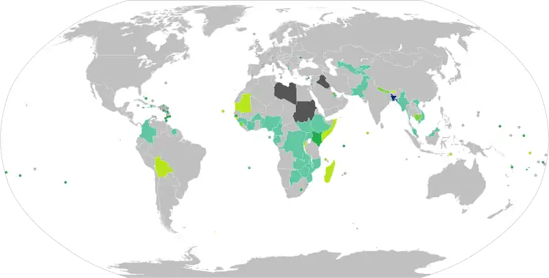 As of 12 January 2024, Bangladeshi citizens who hold regular or ordinary Bangladeshi passports have visa free or visa on arrival access to 42 countries and territories, ranking the Bangladeshi passport 97th in terms of travel freedom (along with North Korea) according to the Henley Passport Index.[21] Bangladeshi citizens who hold Diplomatic passports or Official passports of Bangladesh have visa free or visa on arrival access to many more countries.[22] Previously, Bangladeshi passports were not valid for travel to Taiwan, Rhodesia, South Africa and Israel but that has long changed.