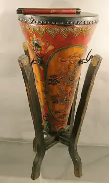 The bangu (Chinese: 板鼓; pinyin: bǎngǔ), often simply gu (Chinese: 鼓; pinyin: gǔ), is a Chinese frame drum that, when struck by one or two small bamboo sticks, creates a sharp dry sound essential to the aesthetics of Chinese opera. Striking the drum in different places produces different sounds. It is also used in many Chinese chamber music ensembles. The percussion section is very important in Chinese Opera, with battle or 'martial' scenes, which are called wu-chang. The bangu player is the director or conductor of the orchestra, working with the other members of the percussion section to create the right mood for the audience and actors on stage.