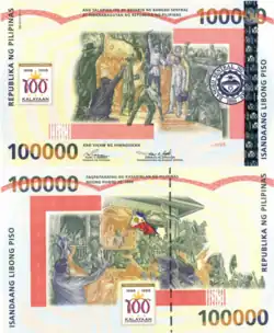 Commemorative ₱100,000 bank note displaying the Katipunan during the Philippine Revolution (top), depiction of the Philippine Declaration of Independence on June 12, 1898 (bottom)