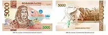 ₱5,000 216 mm × 133 mm[32] Brown Lapulapu, Battle of Mactan, Karakoa, seal of the BSP (Bangko Sentral ng Pilipinas), 2021 Quincentennial Commemoration logo Philippine eagle (Manaol), Coconut tree (Lubi), Mount Apo 2021