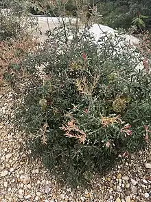 Banksia canei, commonly known as the mountain banksia,[3] is a species of shrub that is endemic to southeastern Australia. It is generally encountered as a many-branched shrub that grows up to 3 m (10 ft) high, with narrow leaves and the yellow inflorescences (flower spikes) appearing from late summer to early winter. The old flowers fall off the spikes and up to 150 finely furred follicles develop, which remain closed until burnt in a bushfire. Each follicle bears two winged seeds. Response to fire is poorly known, although it is thought to regenerate by seed. Birds such as the yellow-tufted honeyeater and various insects forage among the flower spikes. It is frost tolerant in cultivation, but copes less well with aridity or humidity and is often short-lived in gardens. One cultivar, Banksia 'Celia Rosser', was registered in 1978, but has subsequently vanished.[4]
