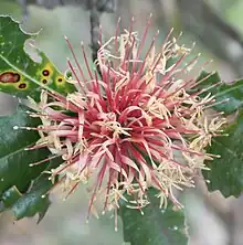 Banksia ilicifolia has a stout trunk up to 50 cm (19.5 in) in diameter, and rough, fibrous, grey bark which is up to 2 cm (1 in) thick.[3] New growth takes place mainly in summer.[6] Young branchlets are covered in hair which they lose after two or three years. Leaves grow on stems less than two years of age, and are arranged in a scattered pattern along the stems although crowded at the apices (branchlet tips). Resembling those of holly, its leaves are a dark shiny green colour, and variously obovate (egg-shaped), elliptic, truncate or undulate (wavy) in shape, and 3–10 cm (1–4 in) long. Generally serrated, the leaf edges have up to 14 prickly "teeth" separated by broad v- to u-shaped sinuses along each side, although some leaves have margins lacking teeth. The leaves sit atop petioles 0.3–1 cm (0.12–0.39 in) in length. The upper and undersurface of the leaves are initially covered in fine hairs but become smooth with maturity. Flowering takes place from late winter to early summer. The inflorescences are dome-shaped flower heads rather than spikes as many other banksias, and arise from stems that are around a year old. No lateral branchlets grow outwards from the node where the flower head arises.[3] The flower heads measure 7–9 cm (3–3.5 in) in diameter, and bear 60 to 100 individual flowers. The inflorescences pass through three colour phases, being initially yellow, then pink, then finally red, before falling away from the head. One to three follicles develop from fertilised flowers, and remain embedded in the woody base of the flower head. Each follicle bears one or two seeds.[7]