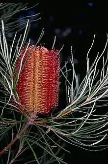 Banksia occidentalis, commonly known as the red swamp banksia,[3] is a species of shrub or small tree that is endemic to the south coast of Western Australia. It has smooth bark, linear, sparsely serrated leaves, golden flowers in a cylindrical spike, and later up to sixty follicles in each spike.
