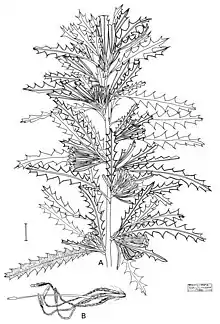 This species was first formally described in 1830 by Robert Brown who gave it the name Dryandra serra and published the description in the Supplementum primum Prodromi florae Novae Hollandiae from specimens collected by William Baxter near King George's Sound in 1829.[4][5] The specific epithet (serra) is a Latin word meaning "saw", referring to the leaves.[6]