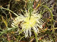 It is a sprawling or erect shrub, up to 3 metres (10 ft) high, without a lignotuber. Leaves are 4 to 16 centimetres (1.6 to 6.3 in) long, and nine to 18 millimetres wide, and pinnatifid, with four to nine triangular lobes on each side, before tapering to a fine point. They are often strongly curved. Flowers are bright yellow, and occur in heads of 45 to 50 flowers, up to 3.5 centimetres (1.4 in) across. Each flower consists of a tubular perianth made up of four fused tepals, and one long wiry style; the head of the style is initially trapped inside the upper perianth parts, but breaks free at anthesis. After flowering, follicles develop in the woody base of the flower head, each containing one or sometimes two seeds.[1][2]