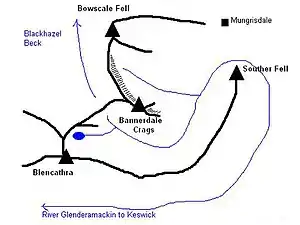Bannerdale Crags is a ridge running north west to south east. The name was originally applied purely to the steep north eastern flank, but is now generally given to the fell as a whole.[1]