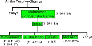 The Banu Ghaniya were a Massufa Sanhaja Berber dynasty and a branch of the Almoravids.[1][2] Their first leader, Muhammad ibn Ali ibn Yusuf, a son of Ali ibn Yusuf al-Massufi and the Almoravid Princess Ghaniya, was appointed as governor of the Balearic Islands in 1126.[3][4] Following the collapse of the Almoravid power at the hand of the Almohads in the 1140s, the Banu Ghaniya continued to govern the Balearic Islands as independent emirs until about 1203, with a brief interruption in the 1180s. Later leaders (Ali ibn Ishaq and Yahya) made a determined attempt to reconquer the Maghreb (and in particular Ifriqiya), taking Bougie, Constantine and Algiers,[5] and conquering most of modern Tunisia[6] from about 1180 onwards.