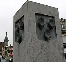 This structure consists of a stone wall, topped by a pediment decorated with the coat of arms of the city, bordered on either side of a balustrade. Under the pediment above the three column list of soldiers killed in 1914–1918 are the words "Pro Patria" in large size followed by the text "La ville de Bapaume à ses enfants" (The city of Bapaume to its children). Further down on the side there is a standing woman with a child clearly symbolizing a widow and an orphan.[28] The woman, hair partially covered with a veil which descends down her back until mid-legs, has her right arm raised to designate a name using a palm held in her hand. She has, in a sign of protection, her left hand placed on the left shoulder of the child who, in short pants, head high, and confident, holds a beret in his right hand and holding a wreath around the left forearm. The bottom section of the monument contains a list in four columns of the missing from the 1939–1945 war.