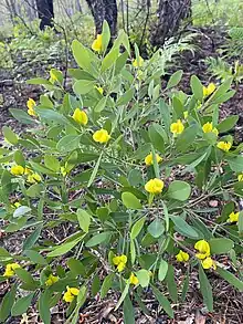 Baptisia lanceolata, the gopherweed, is a species of flowering plant in the family Fabaceae.[2] It is native to the US states of Alabama, Florida, Georgia, and South Carolina.[1] A perennial reaching 3 ft (1 m), it is found in dry sandy areas such as the Carolina sand hills and open piney woodlands such as the longleaf pine ecosystem.[2] It has bright yellow pea like flowers which attract insect pollinators and bees.[3] The Latin specific epithet lanceolata refers to the shape of the foilage.[3]