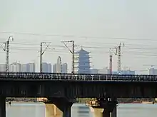 The Longhai railway in Baqiao District, with the Chang'an Pagoda in the background