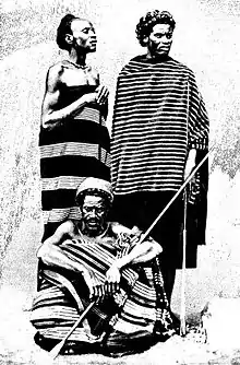 Traditionally, Bara women would weave local cotton to make clothing for themselves and their family members. Cotton continues to be hand picked, ginned and woven using a high-whorl drop spindle. Raw cotton yarn is typically dipped in a softening solution before weaving; prior to softening, the yarn is called fole velo ("living yarn") and is believed to be imbued with magical powers; ombiasy (village wisemen) may tie this yarn around the wrist for protection or wrap it around the bodies of participants in circumcision ceremonies.[31] Less commonly, clothing was made of silk (landy) produced by the local silkworm that fed off indigenous tapia trees growing in the Isalo area. Although this silk was more coarse and uneven than that produced by the Merina or Betsileo people, throughout the island it was the most prized type of silk because of its durability.[32] In the far eastern part of Bara territory, clothing was most commonly made from beaten bark cloth or mats of harefo (Eleocharis plantagines). Women wore tube dresses made of two to three mats stitched together and tied at the shoulder or belted at the waist, often in combination with a bandeau style top of woven mahampy reeds. Men wore beaten bark cloth loincloths with jackets or tunics formed from stitched woven mats; older men's clothing included sleeves.[31] The wearing of charms is common among the Bara, as elsewhere in Madagascar; charms called tsimokotra were historically crafted from the bones of lemurs' feet to relieve fatigue.[33]