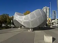 The park features a small greenspace with garden beds and a seating area.[2] The focal point of the park is the Chinook Arc, an interactive illuminated sculpture created by artists Joe O'Connell and Blessing Hancock.[3][4] During the winter the park contains a temporary skating rink.