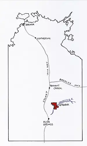 Barbara Weir was born about 1945 at Bundey River Station, a cattle station in the Utopia region (called Urupunta in the local Aboriginal language) of the Northern Territory. Her parents were Minnie Pwerle, an Aboriginal woman, and Jack Weir, a married Irish man[7] described by various sources as a pastoral station owner,[8] "an Irish Australian man who owned a cattle run called Bundy River Station",[9] or an Irish stockman.[10] Under the anti-miscegenation racial laws of the time, their relationship was illegal, and the two were jailed. Weir died not long after his release.[10] Pwerle named their daughter Barbara Weir.