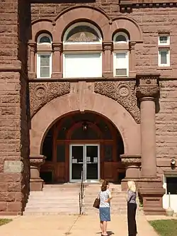 The exterior of the building is constructed of Hummelstown brownstone, a high-quality, medium-grain, dense sandstone quarried near Hummelstown in Dauphin County, Pennsylvania. At the time, the stone would have traveled to West Virginia via the Brownstone to Middletown Railroad and the Middletown and Hummelstown Railroad. This stone is dark brown with reddish to purplish hues. The entirety of the exterior ashlar stonework is rusticated with the exception of the smooth voussoirs defining the arcuated portal and window openings and the stringcourses and window sills. The overall impression created is one of mass and dignity.