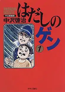 Barefoot Gen (はだしのゲン, Hadashi no Gen) is a Japanese historical manga series by Keiji Nakazawa, loosely based on Nakazawa's own experiences as a Hiroshima atomic bombing survivor. The series begins in 1945 in and around Hiroshima, Japan, where the six-year-old boy Gen Nakaoka lives with his family. After Hiroshima is destroyed by atomic bombing, Gen and other survivors are left to deal with the aftermath. It was published in several magazines, including Weekly Shōnen Jump, from 1973 to 1987. It was subsequently adapted into three live action film adaptations directed by Tengo Yamada, which were released between 1976 and 1980. Madhouse released two anime films, one in 1983 and one in 1986. In August 2007, a live action television drama series adaptation aired in Japan on Fuji TV over two nights.
