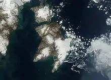 At the northern side of Barentsøya is the ice-free peninsula of Frankenhalvøya, between Ginevra Bay at the western side and Dorstbukta to the east.[14][15] Grimheia is an ice-free mountainous area extending over a length of about thirteen kilometers at the northern part of the island.[16] The westernmost point of the island is the headland of Mistakodden.[17] At the southern part of Barentsøya are the mountains of Krefftberget and Høgrinden, while Jeppeberget is located to the southeast.[18][19][20] The largest lakes of the island are Veslemjøsa in Heimarka, and Dalskilvatnet between the valleys of Sjodalen and Grimdalen.[21][22]