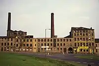 Off Barkerend roundabout was the now partially demolished Barkerend Mills. These mills were established in 1815 as a steam powered worsted spinning mill. The street front buildings being warehouses with an arched gateway into the mill complex behind. More mills were added in 1852 and the last block (seen on the image left with chimney) still remains today, disused and minus the chimney.[2][3]