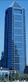 In 1926, the Barnett National Bank Building was opened to house the company's operations and was built in the popular Chicago school style of architecture. At 18 stories, it was the tallest skyscraper in the city and remained so until 1954.[11] The bank survived various economic downturns and crises, including the Great Depression, ultimately emerging stronger. When Barnett died in 1958 at the age of 101, Barnett Bank had come to be known as "Florida's Bank". The bank continued to grow with the acquisition of many more Florida banks over the next two decades.[12]