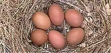 In the 1850s Asian chickens began to arrive in Europe, where they were at first known as "Shanghai" chickens. These were initially cross-bred among themselves, and only later developed into breeds such as the Brahma, the Cochin and the Croad Langshan.[1] From about 1865, some of these Shanghai chickens were cross-bred with local farmyard chickens in the area of Barneveld. Towards the end of the nineteenth century there may also have been some breeding with a type called Amerikaanse Nuthoenders ("American utility birds"), which showed some similarity to the American Wyandotte;[5] it is not known what these birds were, or if they were really American.[1] In about 1906 there may also have been some cross-breeding with British Buff Orpington stock.[6]: 99 According to Hans Schippers, the greatest influence on the characteristics of the Barnevelder was from the Langshan, which contributed hardiness, brown eggs, and good winter production.[5]