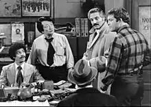 A scene from the season 3 episode “Hash”. Left to right: Ron Glass, Jack Soo, Abe Vigoda (back to the camera), Hal Linden, Max Gail.