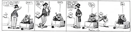 M. Thomas Inge took note of Herriman's interest in silent comedies and observed, "In his appearance, the Baron borrowed his cane and his facial features from Chaplin."[4] Comics historian Ron Goulart stated that while Baron Bean superficially resembled Mutt and Jeff, "Herriman usually shunned conventional jokes and it exhibited some of the graphic eccentricities to be found in more abundance in Krazy Kat."[1] Herriman had previously drawn a similar character, Baron Mooch, in 1909–10.[5][6]