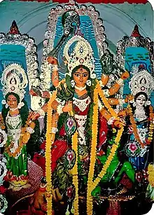 Barowari (Bengali: বারোয়ারি) refers to the public organization of a religious entity, mainly in West Bengal, India. Barowari has significance associated with the Durga Puja festival, in which the Hindu Goddess Durga is worshipped; symbolizing the victory of good over evil. The word "Barowari" comes from the Sanskrit words "bar", which means public, and Persian word "wari", means For.