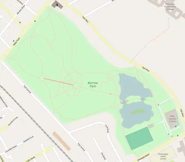 Barrow Park is a 45-acre public park in Barrow-in-Furness, Cumbria, England. It is located entirely within the Parkside ward, to which the park lends its name, bound by Abbey Road, Park Drive, Greengate Street and Park Avenue.[1] Barrow Park was designed by Thomas Mawson in 1908 and was constructed in stages over the following two decades. Originally sited on the outskirts of Barrow, the park is now more or less central due to rapid growth of the town northwards during the early 20th century.[2] It is designated by Historic England as Grade II on the Register of Historic Parks and Gardens.