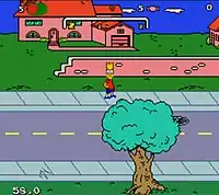 The game is split in two parts. The first is set on a street (probably Evergreen Terrace, but referred to as Windy World). Bart walks around and has to find pages of his homework while avoiding enemies such as living post boxes and various characters from the show. Power-ups that Bart can collect include bubble gum (with which he can blow bubbles to repel enemies or collect floating blue Zs to restore his health), watermelon seeds (which he can spit at enemies to defeat them or make them change direction), pillows (which create a new health bar for him if he runs out of Zs), and his skateboard (which temporarily increases his speed as well as restoring and extending his health bar the longer he is on it). Jimbo and his gang will coerce Bart into strolling with them, causing Bart to lose control of his movements and have to move with them, taking damage as he does. Hitting a flying saxophone will summon Lisa Simpson with pixie wings to sprinkle fairy dust on Jimbo and his gang and transform them into rats, freeing Bart. However, if Bart is by himself, the Lisa pixie will turn him into a frog who cannot attack. If Bart catches a kiss blown to him by an old lady, it will revert him to his human form.