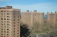 Bernard M. Baruch Houses, or Baruch Houses, is a public housing development built by the New York City Housing Authority (NYCHA) on the Lower East Side of Manhattan. Baruch Houses is bounded by Franklin D. Roosevelt East River Drive to the east, E. Houston Street to the north, Columbia Street to the west, and Delancey Street to the south.[3] The complex, the largest NYCHA development in Manhattan, occupies 27.64 acres (111,900 m2) (equivalent to fifteen blocks), of which buildings cover 13.4%, a percentage similar to that of most "tower in the park" project designs.[4] It has 2,194 apartments, which house an estimated 5,397 people.[3][5] These apartments are distributed throughout 17 buildings.[3] Baruch Houses I is seven stories tall, Baruch Houses XI, XIII, and XV are thirteen stories tall, and the rest (II-X, XII, XIV, XVI-XVII) are fourteen stories tall.[6] Combined, these buildings have 2.9 million square feet (270,000 m2).[3][5]