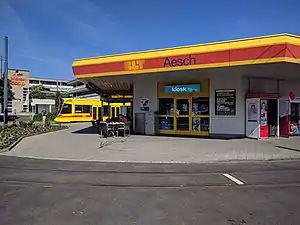 Trambahn Basel-Aesch opened a line between Ruchfeld, in Basel, and Aesch, on 7 December 1907. Trains continued over the Basel tram network and terminated at Aeschenplatz.[2] The line was electrified from opening at 550 V DC, later increased to 600 V DC.[3] In 1974, Trambahn Basel-Aesch merged with three other companies to form Baselland Transport, which continues to own and operate the line.[4]