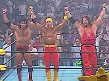 Hulk Hogan then made his way down to the ring as Nash and Hall fled to the outside. In a surprise move, the longtime fan favorite Hogan then performed two Atomic Legdrops to Savage, revealing himself to be Hall and Nash's partner as The Outsiders returned to the ring to celebrate their new alliance as the stunned crowd looked on. The match officially ended in a no-contest after Hogan threw the referee out of the ring and hit Savage with one more Atomic Legdrop.[3] After the main event, the audience began to throw trash in the ring. One fan jumped over the guardrail and tried to attack Hogan, but was taken out by Hall and Nash, before being escorted out of the arena by security. Gene Okerlund entered the ring and asked Hogan why he had turned his back on the fans and how he could align himself with Hall and Nash. Hogan claimed that the three of them were "the future of wrestling" and dubs the new group as "the new world order of wrestling, brother." Hogan went on to justify his actions, saying he was bored with WCW and had grown tired of constantly pandering to the fans, especially considering that more and more of them had started to turn on him since he had joined the company in 1994. Hogan declared their intention to take over the wrestling business and destroy everything in their path.[3]
