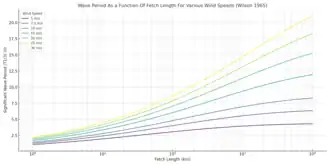 In this equation, t is the wind duration (in hours) and U is the wind speed, in metres per second. If F > Fmin, then the wave growth is limited by the wind duration, and Fmin is used instead of F in Wilson's equations. If F < Fmin, the wave growth is limited by fetch length, and F is used.[15]