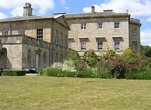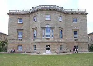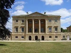 Basildon Park was begun in 1772; the architect, John Carr of York, was one of the leading architects in northern England. His work was initially influenced by the Palladian architects, the Earl of Burlington and William Kent and later by the neoclassicism of Robert Adam.[26] At Basildon, Carr's most southerly commission,[27] both these architectural influences can be discerned. It has been speculated that the principal facade, the West Front, was inspired by Palladio's Villa Emo.[28] Whatever the inspiration, it was one Carr relied on heavily in his work, and it can be seen again most evidently in his designs for Newark Town Hall.