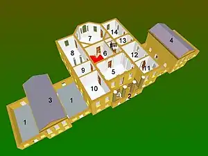 The corps de logis (central block) is built on the three floors. In the 18th century, such floors (known, because of their outer brickwork, as "the Rustic") would have been used by both the owners and their servants. The Rustic contained the wine cellars, Servants' Hall, estate offices, and secondary reception rooms.[30] This is very much the case at Basildon where the former Servants' Hall is now the ground floor visitors' tea room and the former Summer Breakfast Room (beneath the Octagon Drawing Room) which later saw service as a billiard room, is now a lecture room for the mansion's paying visitors. The lower hall, beneath the first floor hall, was the everyday entrance to the mansion for the family.[31]