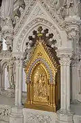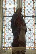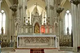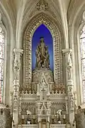 The south apse has a fairly simple altar with Saint Anne and the young Mary. The central apse has a very ornate altar with carved figures on the base of adults bringing children to the Virgin. The retable has angels, spires and Biblical scenes including the raising of Jesus's daughter from the dead. Above the retable is a huge statue of the Virgin standing on a rock with young children lit up by light bulbs. The walls around the altar are covered with Merci plates. The altar in the north apse is again fairly plain with a statue of Saint Joseph and the young Jesus. The north chancel altar is carved stone with carvings of angels on the base and carved leaves around the top of the altar and along the shelf. There is a statue of Mary and Joseph on the host box.