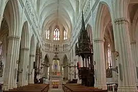 The inside of the church is huge. There are tall elegant fluted pillars with pointed arches and a small carved frieze at the top of the pillars. Above is arcading with round pillars, round arches and windows above. The ceiling is vaulted with roof bosses. At the back of the south aisle is a stone font. Three pillars support a very ornate carved spire with pinnacles above the font. The ambulatory is separated from the choir by pillars and pointed arches. It has three apses each with an altar. The chancel has a crucifix on the walls and a painted statue of the Virgin surrounded by children.