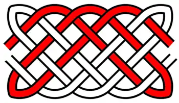 A basket weave knot is made up of two sets of parallel lines drawn inside a rectangle such that the lines meet at the edges of the rectangle. For a true basket weave knot that can be tied with two strands, the number of intersections in each direction cannot have a common divisor. Within this constraint, there is no theoretical upper limit to the size of a basket weave knot.[1] Thus, a knot that has two intersections in one direction can be lengthened with any odd number in the perpendicular direction. If the dimension n in the smaller direction is odd, it is always possible to construct a knot with n + 2 intersections in the other dimension. However, large basket weave knots have a tendency to twist and curl because they are completely flat.[1]