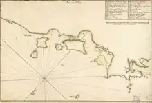 Bastimentos was an island, anchorage and harbour near Portobelo on the north-western coast of Panama discovered and named in Spanish "Isle and port of Provisions" by Christopher Columbus in 1502 during his fourth and last voyage.[2] Although the location of the two adjacent Bastimentos Islands (Great and Little) is largely undisputed, the location of the harbour, shown on several 18th century Spanish maps as on the mainland opposite the islands, is suggested by various modern commentators to lie about 7 miles distant, thus its exact location is now uncertain and a matter of conjecture. Harris (2013) states: "by 1513 the record of (Columbus's) discoveries in this small region had become so clouded that it has since generated countless investigations and over the years a voluminous literature has been created in which attempted reconstructions of the voyage often have been conjectural and controversial".[3] Bastimentos was the place where in 1726/7 the British Admiral Francis Hosier with three thousand of his sailors died of tropical disease whilst anchored with his fleet of 20 ships during the disastrous Blockade of Porto Bello. Due to the popularity of Richard Glover's poem and song Admiral Hosier's Ghost (c.1739), which mentions them twice, the Bastimentos became in England synonymous with "foul dishonour" and "shameful doom". The location should not be confused with Bastimentos Island, Bocas del Toro, 270 km to the west, also discovered by Columbus on his 4th Voyage, before reaching Portobelo.