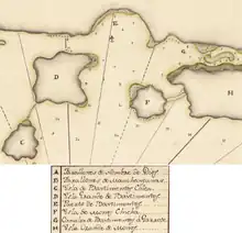 The island shown on Spanish maps made in about 1700 as Isla Grande de Bastimentos (Big Island of Bastimentos) is today known as “Isla Grande”,[1] and is joined by a short reef to the small island on the north called in the old maps Isla de Bastimentos Chica (Little Island of Bastimentos). The natural inlet or harbour 1 km to the south on the mainland is marked as Puerto de Bastimentos (Port of Bastimentos), and an inverted anchor is drawn in its midst indicating the position of the anchorage, with depths marked as 6 and 7 fathoms. However Morison equates Puerto de Bastimentos / El Puerto de Bastimentos de Colon with the port of Nombre de Dios,[10] 7 miles to the east.[8]