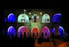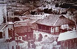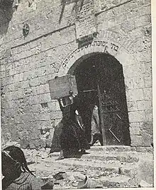 The complex, located near the Old City wall, was the last courtyard left in control of the defenders of the Jewish Quarter when it fell during the War of Independence (with the central cellars used as shelter for Jews),[7] and from the square in the compound, the defenders of the Quarter were taken captive by the Jordanian Legion.[8] In the courtyard of the building, at the corner of Gilad Street, the bodies of those who died in combat were buried, since they could not be buried outside the walls of the besieged Quarter. The mass grave was erected with the approval of the Rabbi of the Western Wall and the Holy Places, Rabbi Yitzhak Avigdor Orenstein, despite the historical prohibition of burying the dead inside the Old City. The deceased were transferred on 4 August 1967 to a mass grave on the Mount of Olives, where they received a military burial and official tombstones.[9]