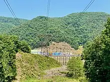 The upper and lower reservoirs are created by earth and rock-filled embankment dams. The upper reservoir dam is 460 feet (140 m) high, 2,200 feet (670 m) long and has a structural volume of 18,000,000 cubic yards (14,000,000 m3). The upper reservoir on Little Back Creek has a surface area of 265 acres (107 ha) and storage capacity of 35,599 acre-feet (43,911,000 m3). The lower reservoir dam on Back Creek is 135 feet (41 m) high and 2,400 feet (730 m) in length. It has a structural volume of 4,000,000 cubic yards (3,100,000 m3) and creates a reservoir with a surface area of 555 acres (225 ha) and storage capacity of 27,927 acre-feet (34,447,000 m3).[7][4] Connecting the upper reservoir to the power station are three water conduits between 3,100–3,600 feet (940–1,100 m) long. The conduits each lead to a 990 feet (300 m) shaft which bifurcates into two penstocks (for a total of six) before reaching the turbines. Each penstock is 18 feet (5.5 m) in diameter and between 900–1,260 feet (270–380 m) in length. Maximum static pressure from the top of the water delivery system to the turbines is 1,320 feet (400 m).[7][9]