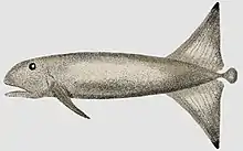 Two features on the sailfin stood out, according to Beebe. He described the colour as sickly, pale and olive-coloured. In his own words, “the hue of water-soaked flesh”. The caudal fin was reduced, much like a “button”. The “vertical” fins which are assumed to be the anal and dorsal fin, extended greatly beyond its body. He admitted that he did not see the pelvic fins, and thus the illustration subsequently produced lacked them.[2]"