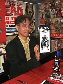 Artist David Mazzucchelli with the statue based on his artwork in the series at a June 28, 2012 book signing at Midtown Comics in Manhattan.