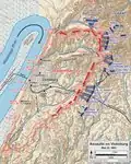 June 1, 1864, Battery E marched to Guntown, Mississippi, where it took part in the disastrous Battle of Brice's Crossroads on June 10. Together with the 9th Minnesota Infantry, the battery initially formed a reserve force deployed near the crossroads itself.[87] Attacked by Confederates under General Forrest on both flanks at once, Colonel William McMillian, commanding the infantry on that portion of the field, ordered Battery E to sweep the Guntown Road with grapeshot and canister.[88] Despite heroic efforts by the 9th Minnesota and other Federal units the Northern army was pushed back, with Col. McMillian ordering Battery E with Battery B of the Second Illinois Light Artillery to hold off the Rebels until the infantry could escape.[89]